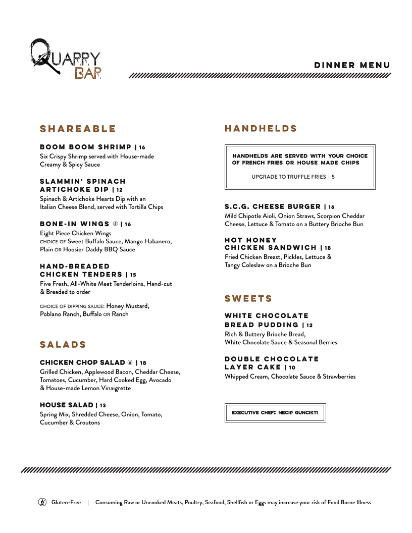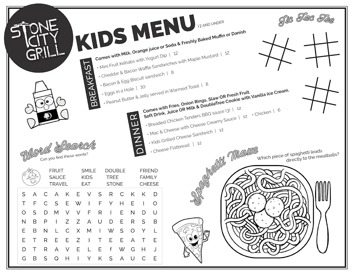 Stone City Grill offers a diverse and satisfying menu that caters to various tastes. For those looking to share, options like Boom Boom Shrimp and Slammin' Spinach Artichoke Dip are perfect starters, while Bone-in Wings and Hand-Breaded Chicken Tenders provide savory choices. Salad lovers can enjoy a refreshing Chicken Chop Salad or a classic House Salad. If you're in the mood for a handheld, the S.C.G. Cheeseburger and Hot Honey Chicken Sandwich stand out as flavorful options. For dessert, indulge in the rich White Chocolate Bread Pudding or the decadent Double Chocolate Layer Cake. The kids' menu offers a variety of breakfast and dinner options, from Mini Fruit Kebabs with Yogurt Dip to Breaded Chicken Tenders with BBQ Sauce and creamy Mac & Cheese. Breakfast enthusiasts will appreciate the hearty choices available, including the Breakfast Burrito, French Toast or Pancakes, and the customizable Create Your Own Three Egg Omelet. With a selection of a la carte sides like Low Fat Fruit Yogurt and Breakfast Potatoes, Stone City Grill provides a well-rounded and delicious menu for all ages.