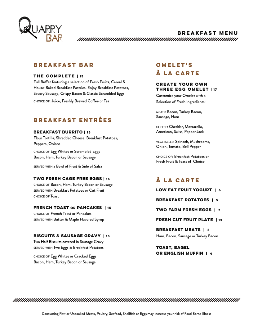 Full Buffet featuring a selection of Fresh Fruits, Cereal & House-Baked Breakfast Pastries. Enjoy Breakfast Potatoes, Savory Sausage, Crispy Bacon & Classic Scrambled Eggs choice of: Juice, Freshly Brewed Coffee or Tea